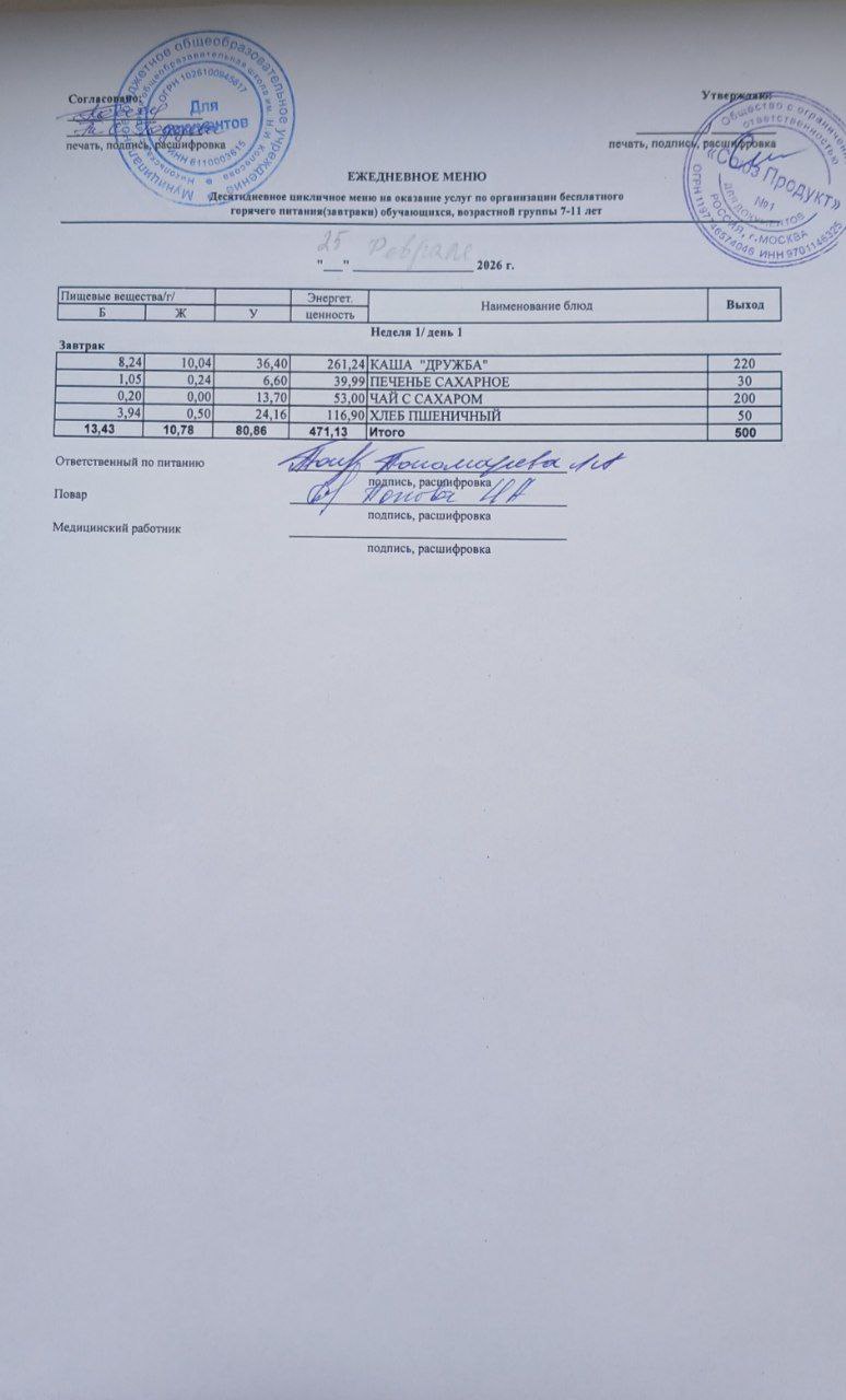 Меню на 25.02.2026г